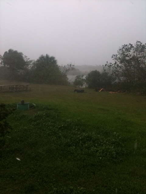 You probably can’t tell a lot from the picture. That’s because I was battling 40+ MPH winds and a torrential downpour just to get a quick shot from the doorway. Suffice to say though, the wind literally vibrating the walls of our trailer woke me up and Andrew saying “get dressed, we may need to leave” was enough to shake me out of my sleepy self.
