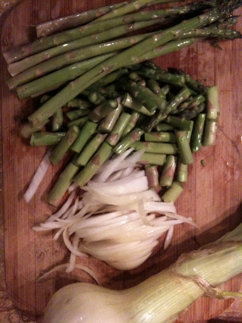 5. Add onions and allow to cook for 1-2 minutes before adding asparagus